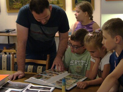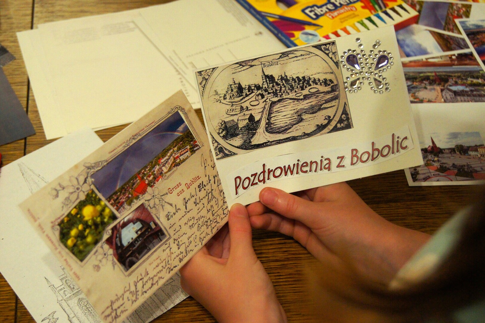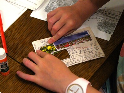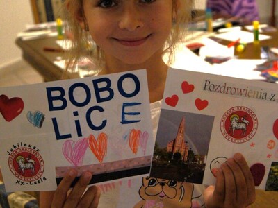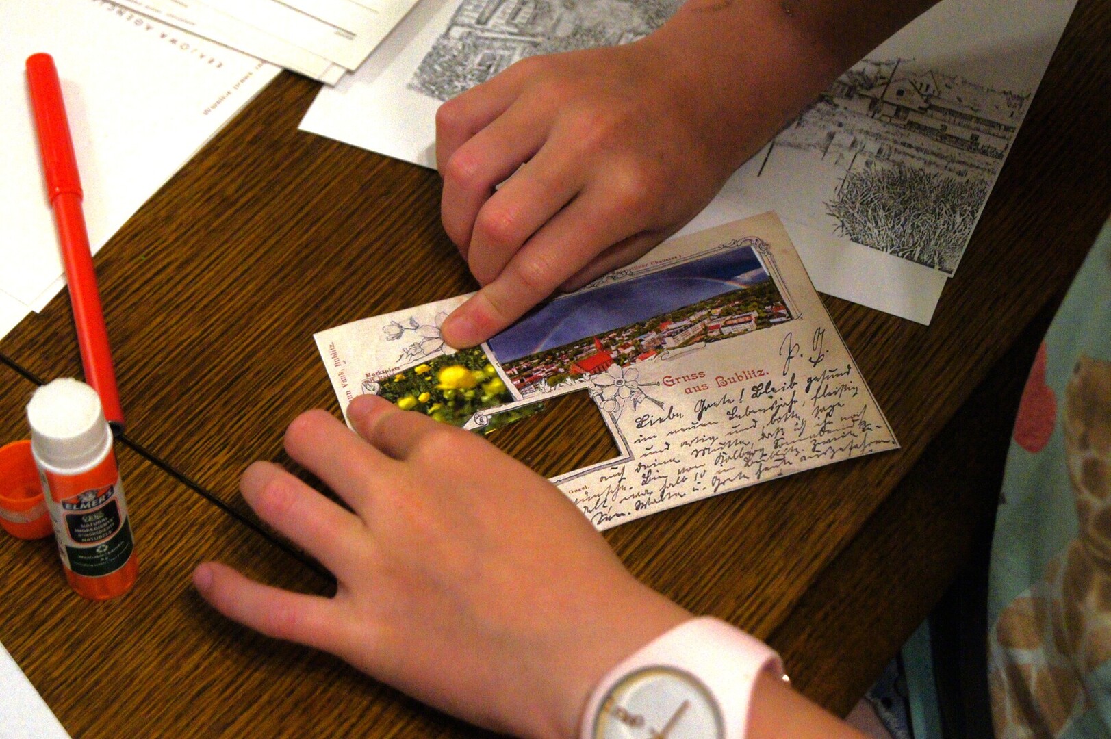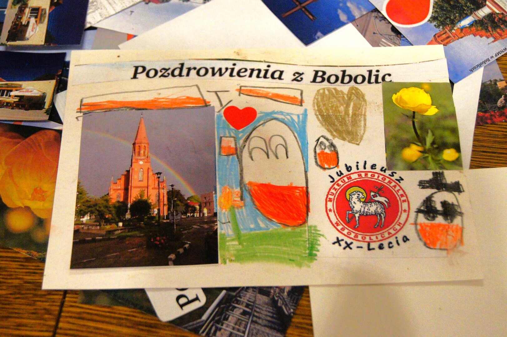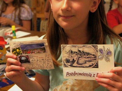 Na początku uczestniczące w zajęciach dzieci poznały krótką historię głównej bohaterki spotkania - pocztówki. Poznaliśmy wiek najstarszych pocztówek, genezę powstania tej odkrytej formy korespondencji, jej rodzaje, techniki wykonania oraz wspólnie obejrzeliśmy oryginalne przedwojenne i powojenne pocztówki znajdujące się w zasobie naszego muzeum.