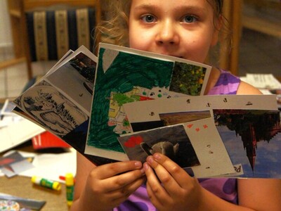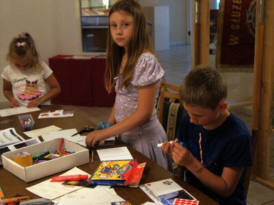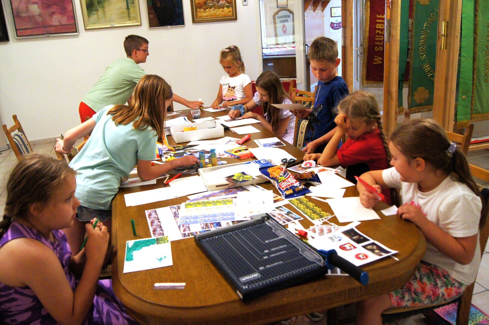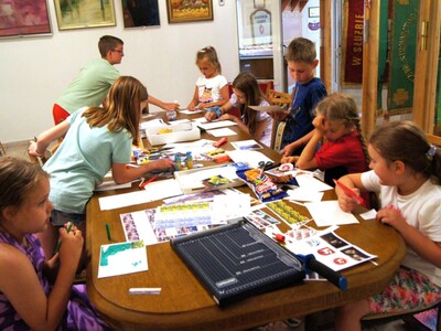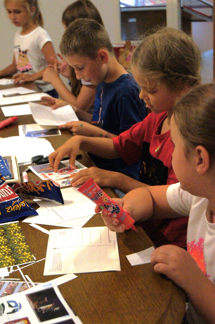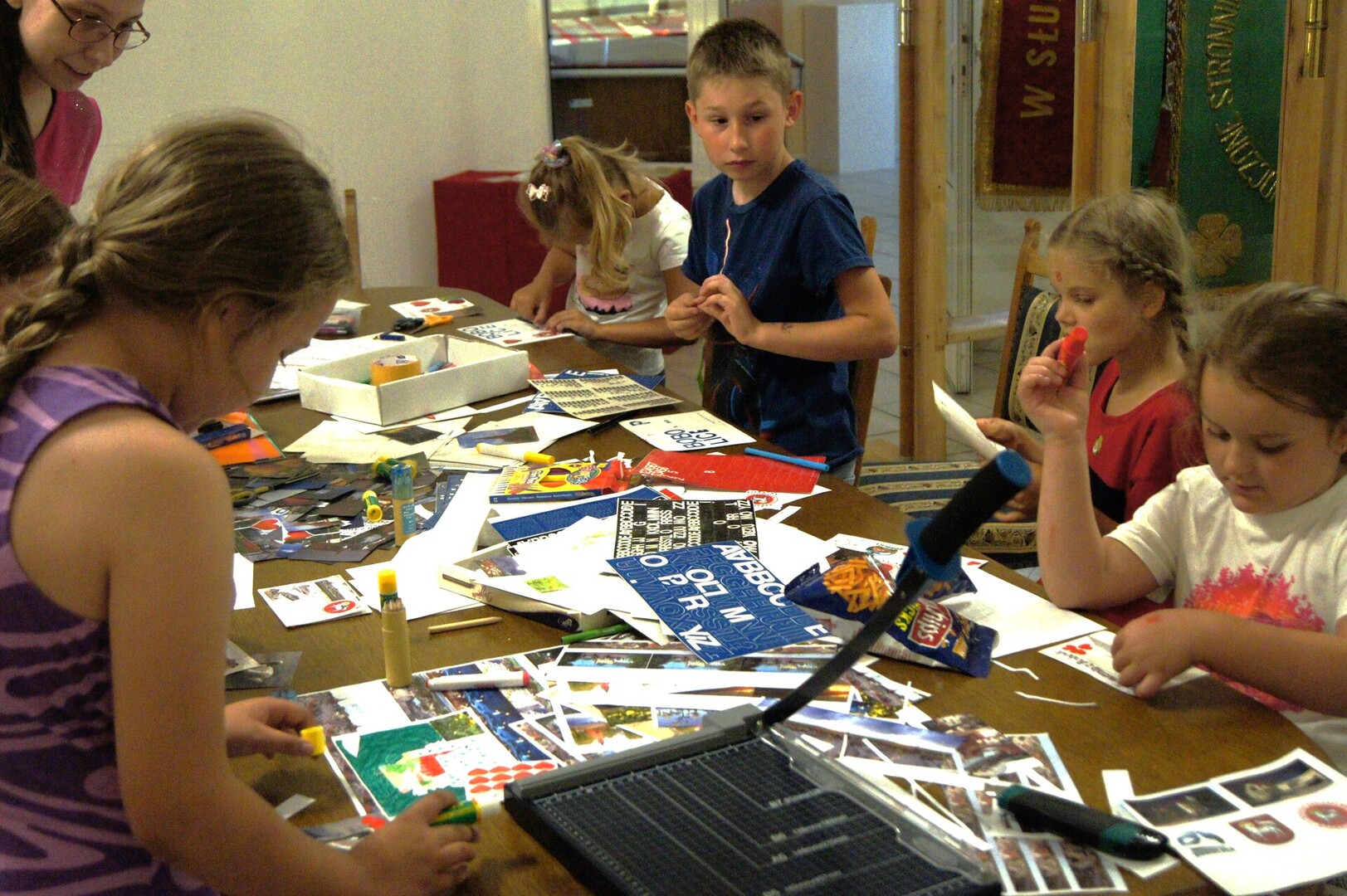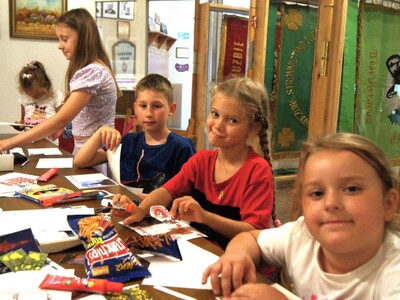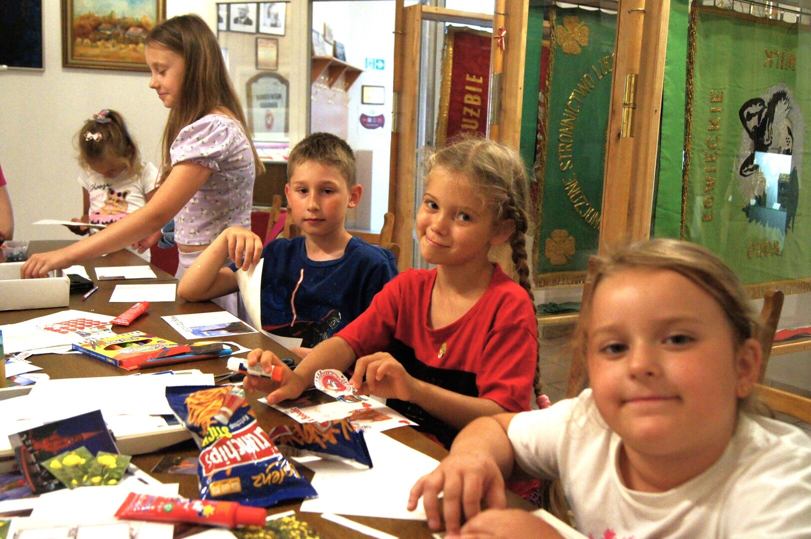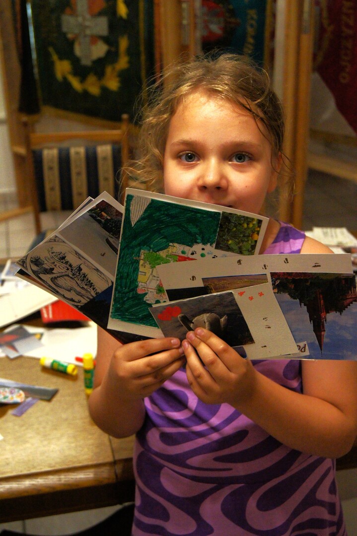 Po krótkim wstępie zainspirowane opowieściami i widokami dzieci przystąpiły do pracy nad własnymi wersjami wakacyjnych pocztówek. Twórcza wena zapełniła całe muzeum i na pierwsze dzieła nie trzeba było długo czekać. Nożyczki, klej, kredki, flamastry, naklejki i inne pomoce małych artystów nie miały wytchnienia, a najaktywniejsi z nich stworzyli nawet 8 różnych wzorów. Zapewne niebawem wyruszą w daleką drogę, niosąc ze sobą pozdrowienia dla bliskich i przyjaciół naszych artystów.
