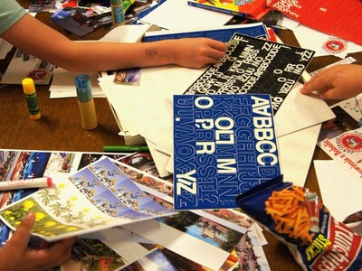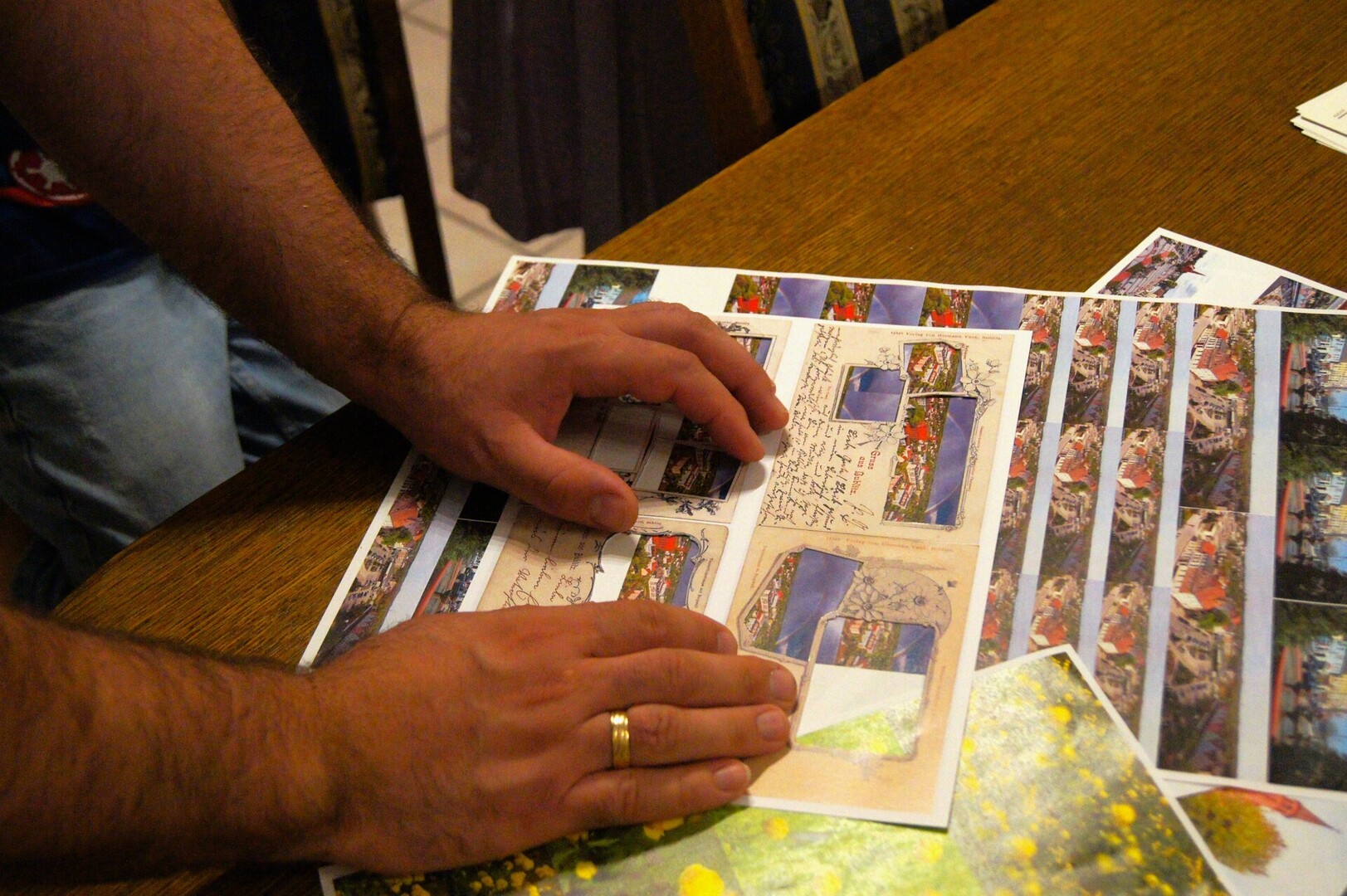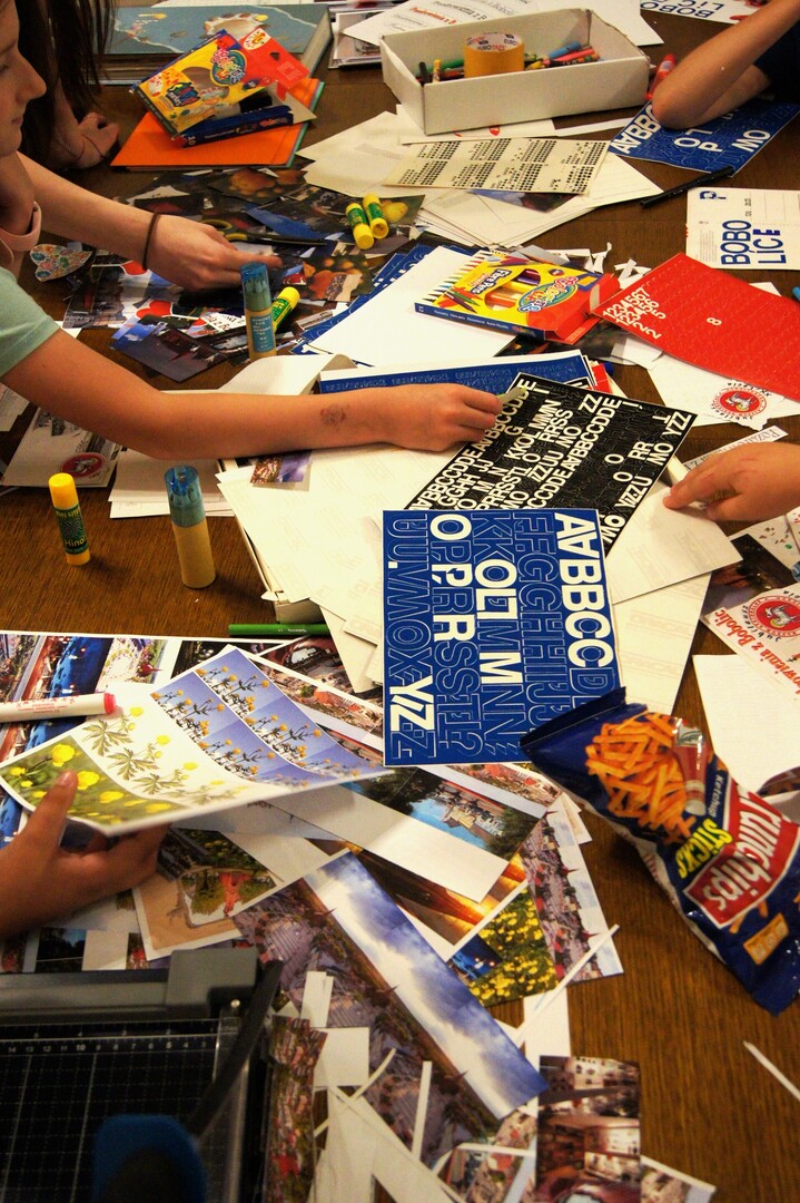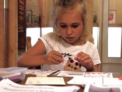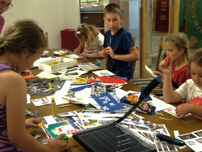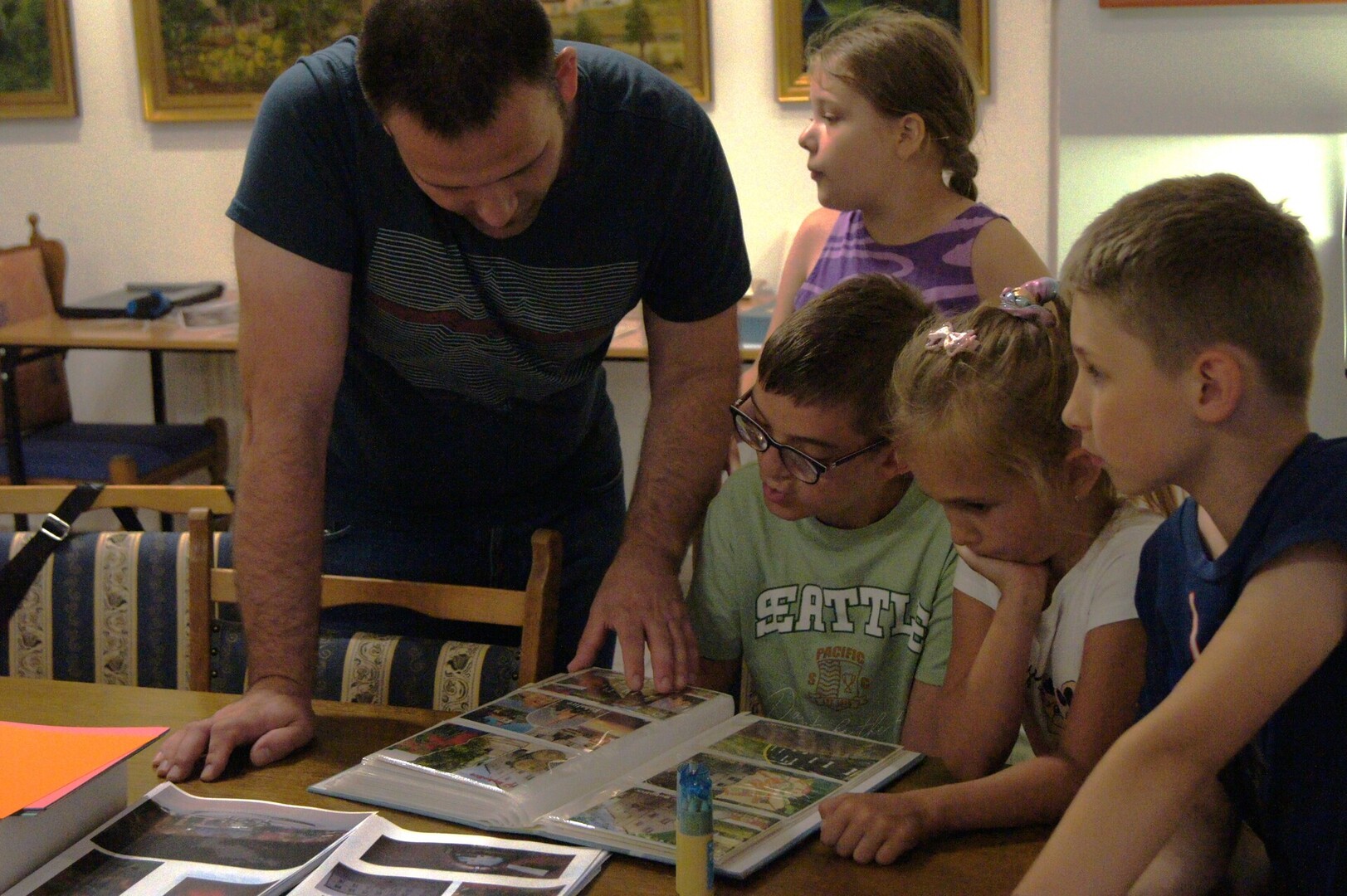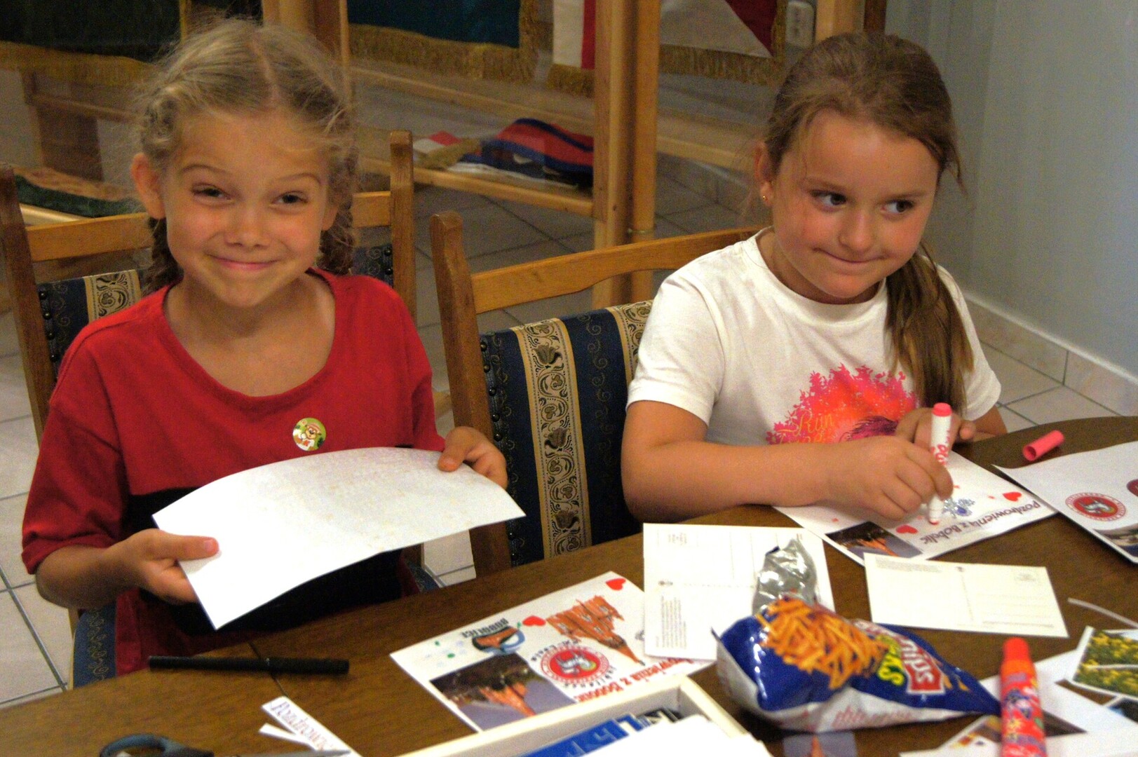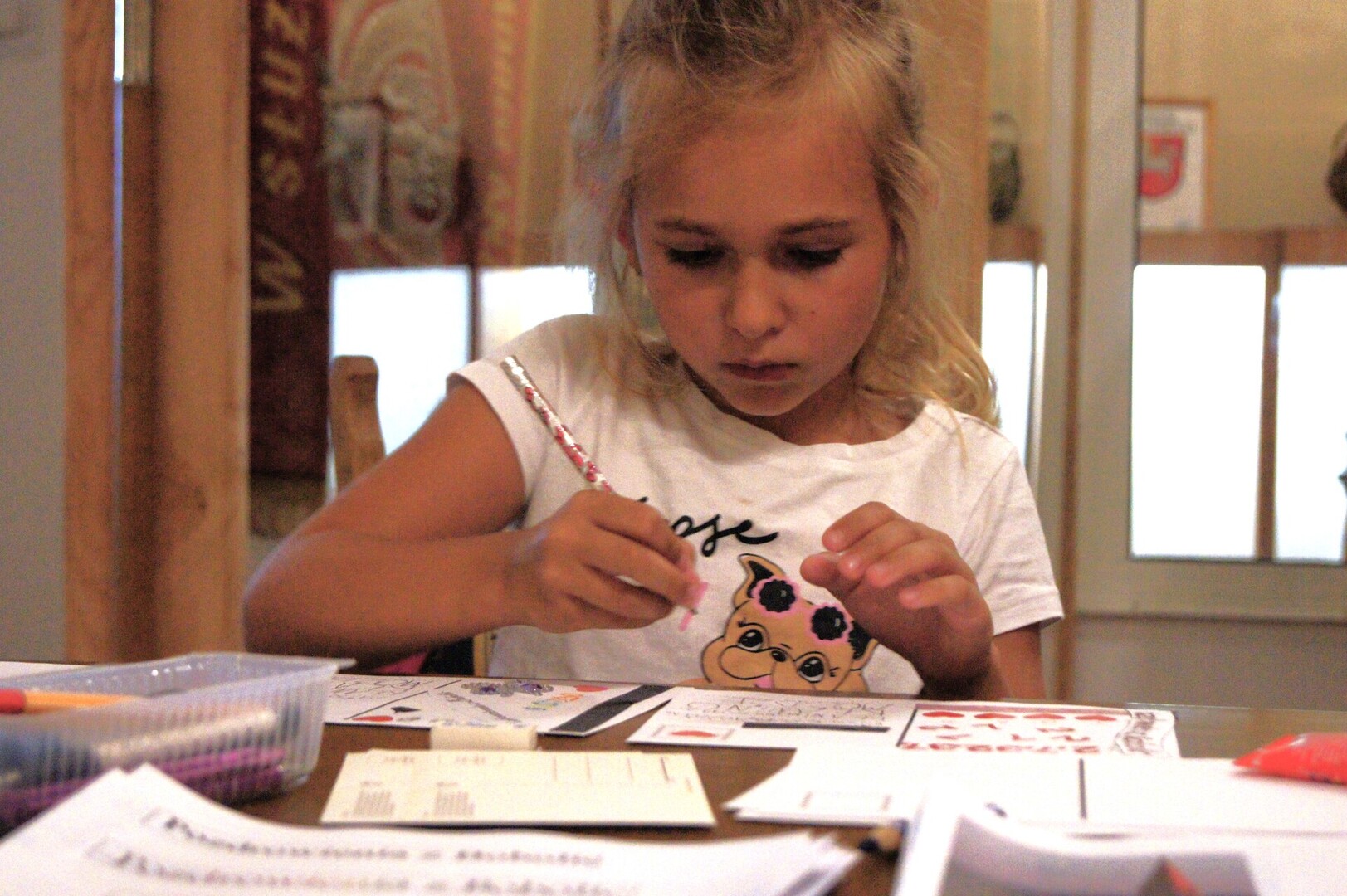 Po krótkim wstępie zainspirowane opowieściami i widokami dzieci przystąpiły do pracy nad własnymi wersjami wakacyjnych pocztówek. Twórcza wena zapełniła całe muzeum i na pierwsze dzieła nie trzeba było długo czekać. Nożyczki, klej, kredki, flamastry, naklejki i inne pomoce małych artystów nie miały wytchnienia, a najaktywniejsi z nich stworzyli nawet 8 różnych wzorów. Zapewne niebawem wyruszą w daleką drogę, niosąc ze sobą pozdrowienia dla bliskich i przyjaciół naszych artystów.